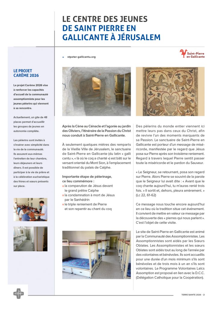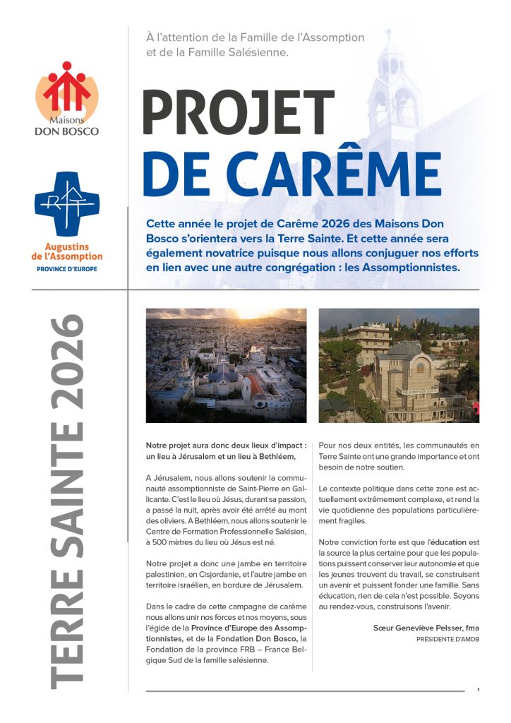 Cette année le projet de Carême 2026 des Maisons Don Bosco s’orientera vers la Terre Sainte. Et cette année sera également novatrice puisque nous allons conjuguer nos efforts en lien avec une autre congrégation : les Assomptionnistes.