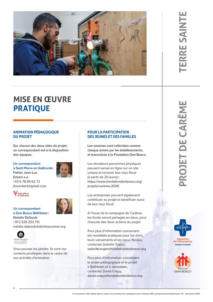 - Pour plus d’information concernant le projet pédagogique et le projet à Bethléem et à Jérusalem, contactez David Crépy, david.crepy@fondationdonbosco.org